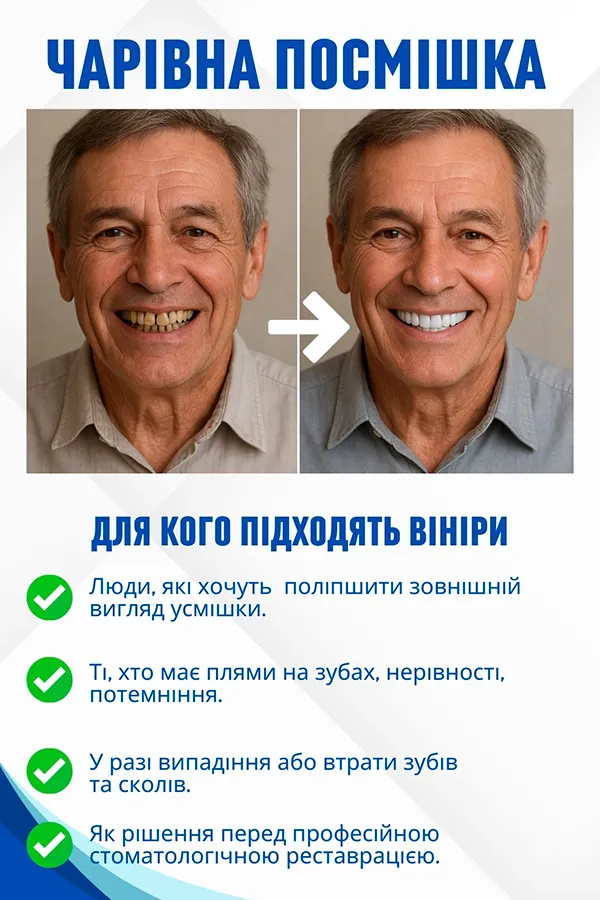 підходить для людей, у яких бракує кількох або навіть усіх передніх зубів.